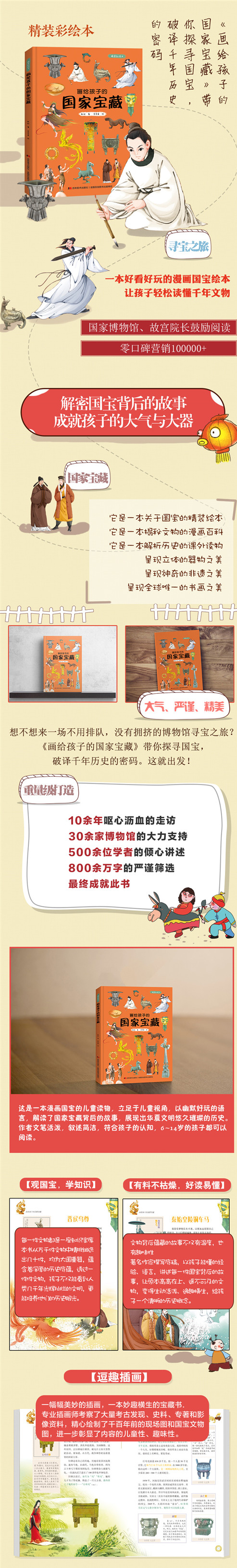 这是一本漫画国宝的儿童读物,立足于儿童视角,以幽默好玩的语言,解读了国家宝藏背后的故事,展现出华夏文明悠久璀璨的历史。作者文笔活泼,叙述简洁,符合孩子的认知,6~14岁的孩子都可以阅读。 《画给孩子的国家宝藏》五大特色 【观国宝,学知识】每一件文物都是一座知识宝库! 本书从万千件文物中精挑细选出几十件,均为大国重器,蕴含着深厚的历史底蕴,透过一件件文物,孩子不仅能看到人类几千年光辉灿烂的文明,更能培养他们的历史眼光。 【有料不枯燥,好读易懂】文物背后蕴藏的故事不仅有温度,也有趣味性 著名作家撰写底稿,以孩子能懂的经验、语言,讲述每一件国宝背后的故事,让原本高高在上、遥不可及的文物,变得生动活泼、逸趣横生,给孩子一个清晰的历史概念。 【逗趣插画】一幅幅美妙的插画,一本妙趣横生的宝藏书 专业插画师考察了大量考古发现、史料、专著和影像资料,精心绘制了千百年...