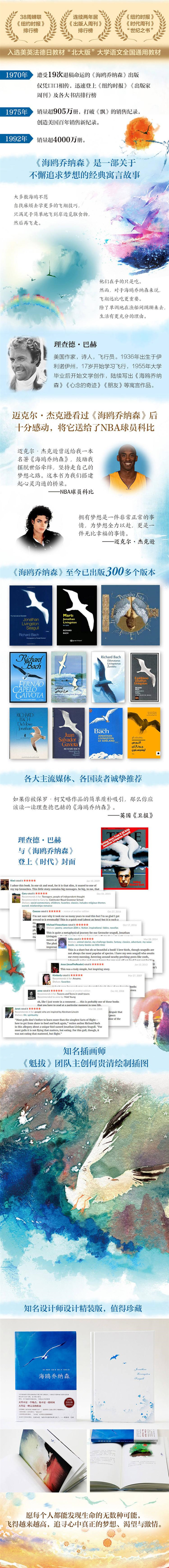 ★创百年畅销纪录的现象级奇迹之书《海鸥乔纳森》完整版出版,作者全新增补第四章 ★知名插画师、《魁拔》团队主创何贵清,绘制全彩精装珍藏版 ★与《牧羊少年奇幻之旅》《小王子》齐名,为梦想全力以赴,是一件无比幸福的事情 ★《纽约时报》《时代周刊》“世纪之书”,入选 “北大版”大学语文全国通用教材 ★38周蝉联《纽约时报》畅销榜单首,连续2年位居《出版人周刊》畅销榜单首 ★NBA球员科比、迈克尔·杰克逊倾情推荐