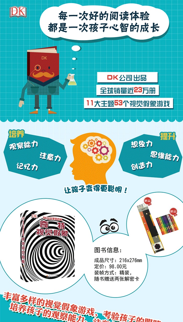 《DK玩出来的百科:奇特视觉假象》是一本让人叹为观止的书,内含50多种令人瞠目结舌的假象。 《DK玩出来的百科:奇特视觉假象》丰富多彩、令人炫目的假象让你看到根本不存在的事物,并完全震撼你。 拿起标签,转动纸片,揭露假象背后的真相,并了解假象产生的原因。 自制三维模型,创造属于你的立体假象。