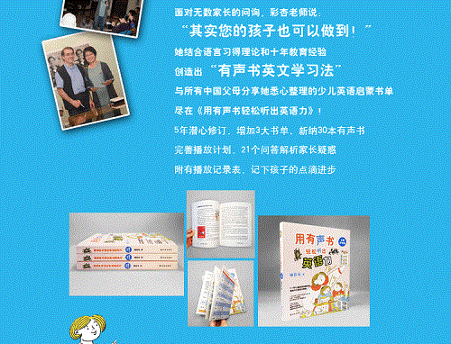 《用有声书轻松听出英语力》是一部真正着眼于中国儿童的语言学习环境、为中国孩子量身打造的高品质英语学习类家庭教育图书,具有极强的实际操作性。彩杏老师在书中分享了她与一对双胞胎听读英语童书的快乐经历及教导儿女轻松学英文的宝贵经验。她将幼儿英语启蒙分解成三大步骤——“准备有声书,按下播放键,画个小钩钩”,遴选出130本英语童书,将一年的学习计划合理分配到52周的每一天中去。让家长学会如何将语言学习转变为儿童一次次精彩的听读体验。