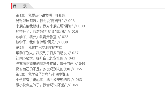 本书是针对3~6岁儿童设计的社交能力培养手册。以俏皮可爱的图画和诙谐幽默的故事,引导孩子和小动物一起体验生活,察觉自我,通过阅读寻找自己的影子。帮助孩子学会懂礼貌、学会说话沟通、融入集体生活、学会合作和分享、学会化解矛盾冲突五大社交主题,帮助孩子提升在不同情境中的社交能力,建立良好的人际关系,更好地融入社会,成为受欢迎的小朋友。