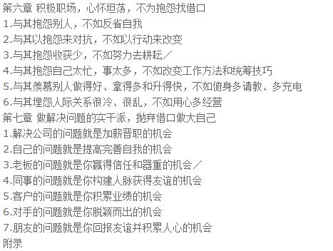 2.优秀员工找方法,平庸员工找借口有一位励志讲师说过这样一番话:“一个爱找借口为自己开脱的员工,永远也难以成为职场佼佼者;一个一味寻找借口的企业也永远难以成为杰出的企业,这是一个不是定律的定律。”好逸恶劳和推卸责任是人天性中的弱点,任何一个人在面对挫折和失败的时候内心都会本能地充满矛盾,并为面临的挫折和失败而深感纠结。