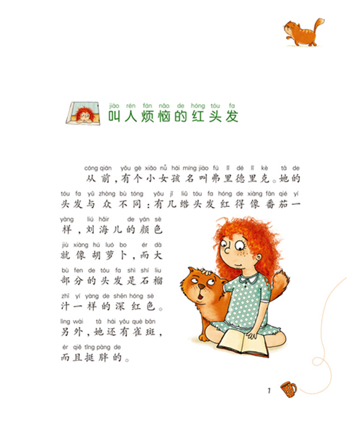 从前,有个小女孩名叫弗里德里克。她的头发与众不同:有几绺头发红得像番茄一样,刘海的颜色就像胡萝卜,而大部分的头发是石榴汁一样的深红色。另外,她还有雀斑,而且挺胖的。