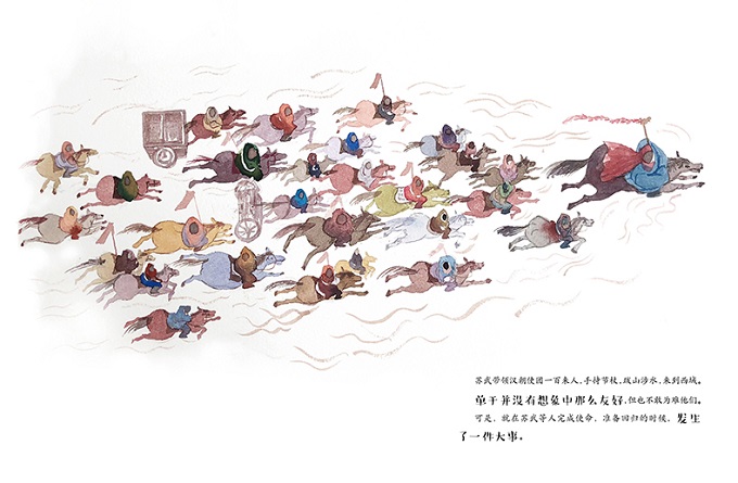 《苏武牧羊》的故事来自《汉书·苏武传》。汉武帝派苏武等出使匈奴。谁知匈奴王单于出尔反尔,把苏武扣留下来,并多次对苏武威逼利诱劝降。苏武宁死不从,被流放到苦寒之地北海(今贝加尔湖,一说甘肃民勤)牧羊,扬言要公羊生子方可释放他回国。苏武在荒无人烟的冰天雪地中历尽艰辛,持节不屈。直到19年后汉朝和匈奴的战争结束,恢复正常邦交,白发苍苍的苏武才得以回到汉朝。
