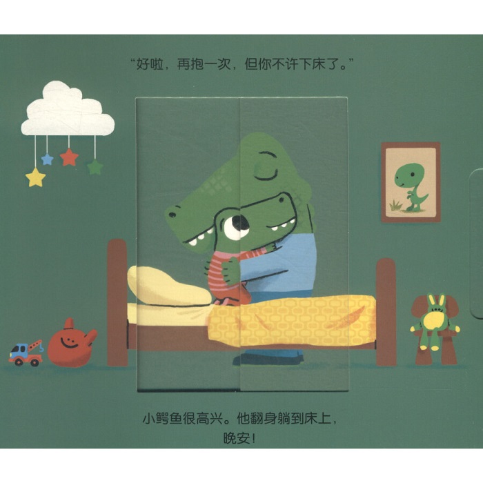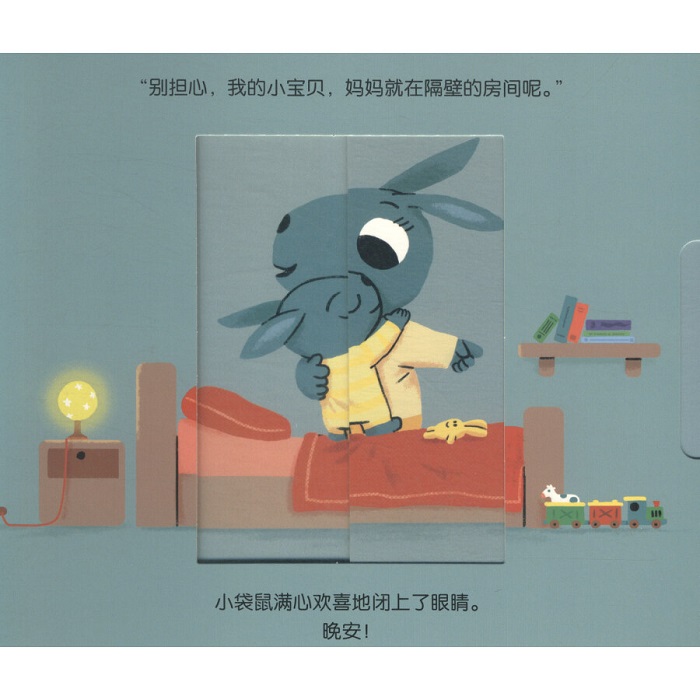 《睡觉喽!》该睡觉啦,可是宝贝们谁也睡不着!有的小朋友怕黑,有的找不着毛绒小兔子,有的还想多玩一会儿。通过推拉,小朋友们可以看到图片发生了变化,还会发现动物宝宝们是怎样克服困难,进入甜蜜梦乡的。