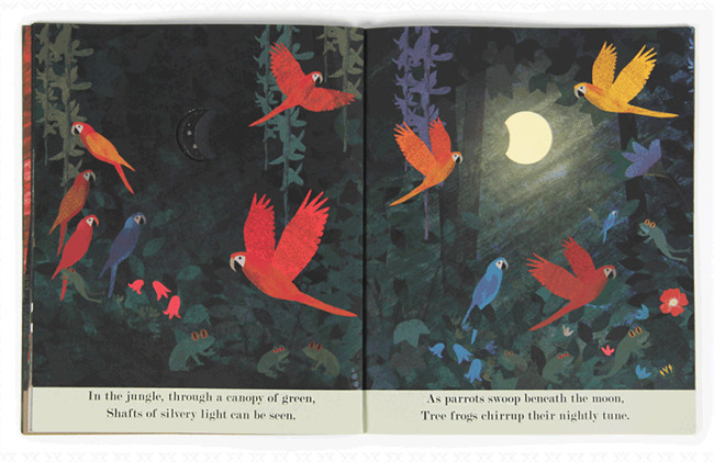 月下的世界,即安逸宁静,又生机勃勃。一只蝎子爬进了夜,身上闪着怪异的光;鸟群飞往南方温暖的气节,月亮始终为它们指路;一群鹦鹉飞落月光底下,树蛙开始了呱呱夜曲,带夜深月明,小田鼠开始工作,忙碌的窜来窜去,在稍凉的夜里觅食。