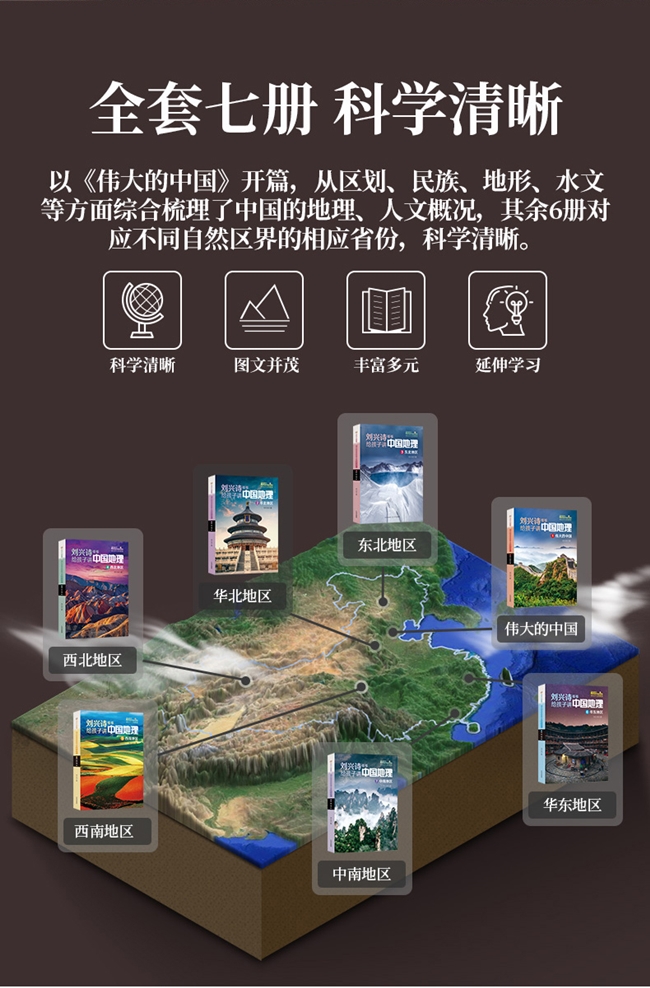 《刘兴诗爷爷给孩子讲中国地理》是著名科普作家刘兴诗为孩子们创作的中国地理百科,共7册,分别讲述了伟大的中国、华北地区、东北地区、华东地区、中南地区、西北地区、西南地区的地理风貌和人文风情。用诗意而贴近生活的语言,丰富的地貌及人文景观图片,多元的专题和示意图,为孩子们展现了华北图区的自然地貌、水温气候、风土人情。