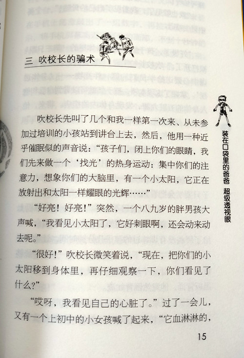 装在口袋里的爸爸发明了超级眼药水,杨歌滴下后,世界全变了!因为他的眼睛变成了“透视眼”,他看路上的行人全都变成了会动的骷髅, 能透过大楼的水泥墙壁看到大楼里的事物,能透视彩票的中奖号码……并且,他还成了“火眼金睛”,一眼看透形形色色的骗局、能鉴别假玉石、假古董……此外,他的眼睛还能意念移物、环视、眺望千里外的事物……但是有一天,超级眼药水被盗了,顿时,超人遍地、世界大乱,这一回,拇指爸爸和杨歌将如何收拾乱局呢?