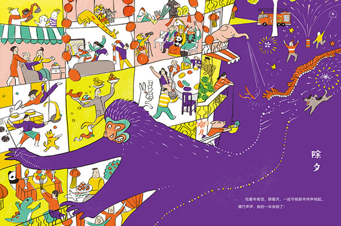 摩登的中国人,怎么庆祝传统春节?本书展示了从腊八到除夕再到元宵节整个过年期间的传统习俗和场景,十二生肖在故事中集结,陪伴中国家庭的大人和小孩,喝腊八粥、赶春运、打年糕、贴年红、包饺子、吃汤圆…… 图画借鉴传统朱仙镇木版年画的墨线套印工艺,以丰富的细节、大胆的撞色展现古老又时尚的中国;又从典籍和民间故事中汲取文化元素,每一个画面都包含了很多与传统习俗有关的事件、形象、物品,有吃了美味嘴巴甜甜的灶王爷,有传说中以爆竹驱之的山魈,有元宵夜偷青的熊猫,充满可解读的细节,增加了阅读的宽度和趣味。