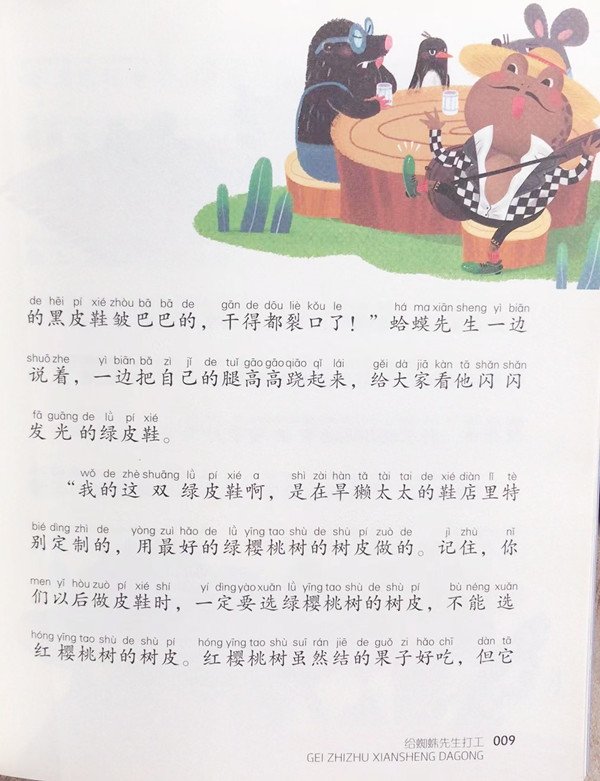 瞧,蜘蛛先生来了!他的午餐真丰富:一只手端着一碟香烤蚱蜢干,一只手端着一碟油炸虾米,一只手端着一碟玉米饼,还有一只手端着鲜榨的果汁。不过,他对店员吝啬得惊人!谁会去他的杂货店工作呢?请看——穿黑西装、白衬衫的公鸡来应聘啦!