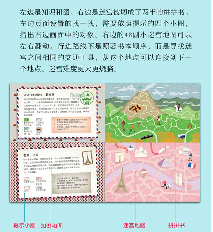 左边是知识和图,右边是迷宫被切成了两半的拼拼书。左边页面设置的找一找,需要依照提示的四个小图,指出右边画面中的对象。右边的48副小迷宫地图可以左右翻动,行进路线不是照著书本顺序,而是寻找迷宫之间相同的交通工具,从这个地点可以连接到下一个地点。迷宫难度更大更烧脑。