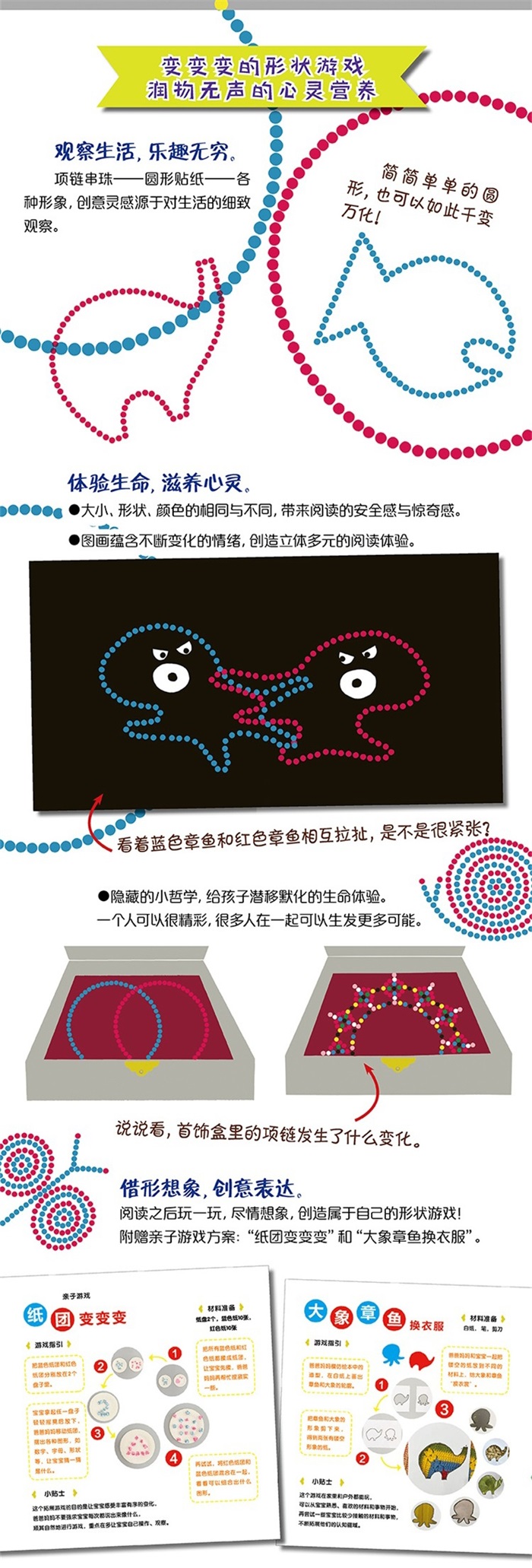 •作者别出心裁地用孩子熟悉的圆形贴纸来表现项链,贴切适宜,易于理解。 •既是故事,也是游戏。形状组合由易到难,循序渐进,符合孩子认知规律。 •项链串珠到圆形贴纸的转换,引导孩子细心观察生活,从观察开始,学会创造。 •趣味十足的故事激发孩子的想象力和表达愿望,用各种身边材料来创编故事,尽情游戏。