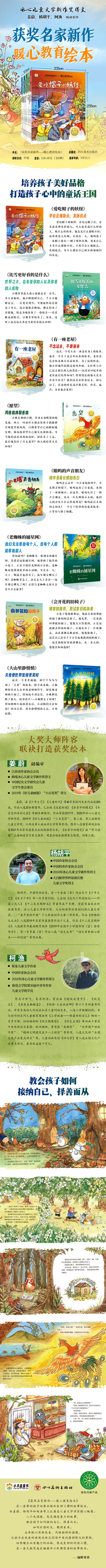 培养孩子美好品格,打造孩子心中的童话王国 《爱吃帽子的妖怪》:学会正视缺点,发扬优点;《比雪更好看的是什么》:世界之大,总有爱你的人以及你爱的人或物; 《有一座老屋》:不念过去,不畏将来; 《愿望》:用善意换取善意; 《嗷呜的声音朋友》:陪伴是最长的告白; 《老蜘蛛的捕星网》:我们无法帮助每个人,丹每个人都能帮助别人; 《会开花的旧椅子》:明智的放弃,胜过盲目的执着; 《大山里静悄悄》:关爱使世界变得更美好