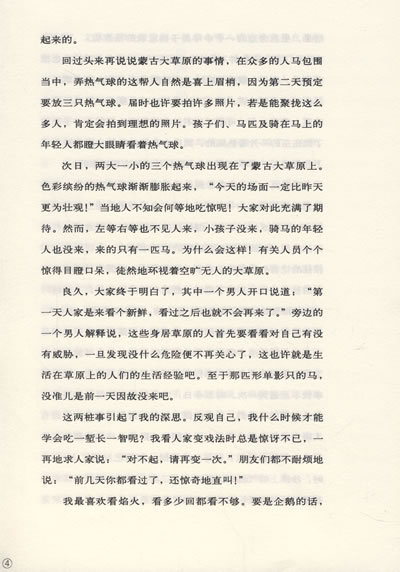 次日,两大一小的三个热气球出现在了蒙古大草原上。色彩缤纷的热气球渐渐膨胀起来,“今天的场面一定比昨天更为壮观!”当地人不知会何等地吃惊呢!大家对此充满了期待。然而,左等右等也不见人来,小孩子没来,骑马的年轻人也没来,来的只有一匹马。为什么会这样!有关人员个个惊得目瞪口呆,徒然地环视着空旷无人的大草原。