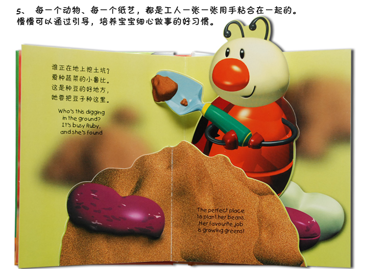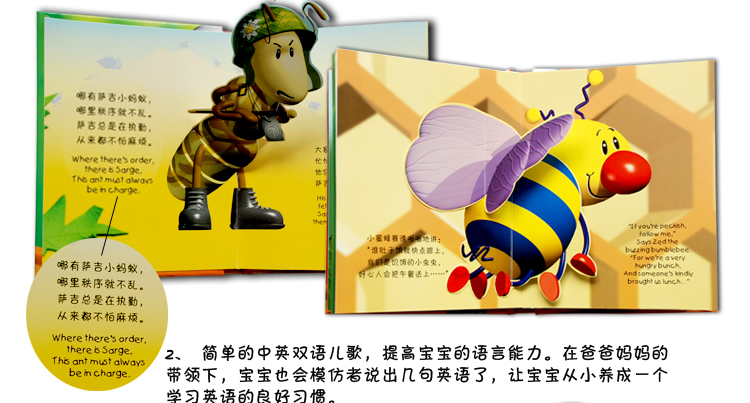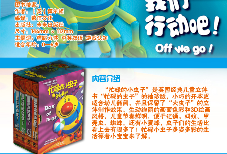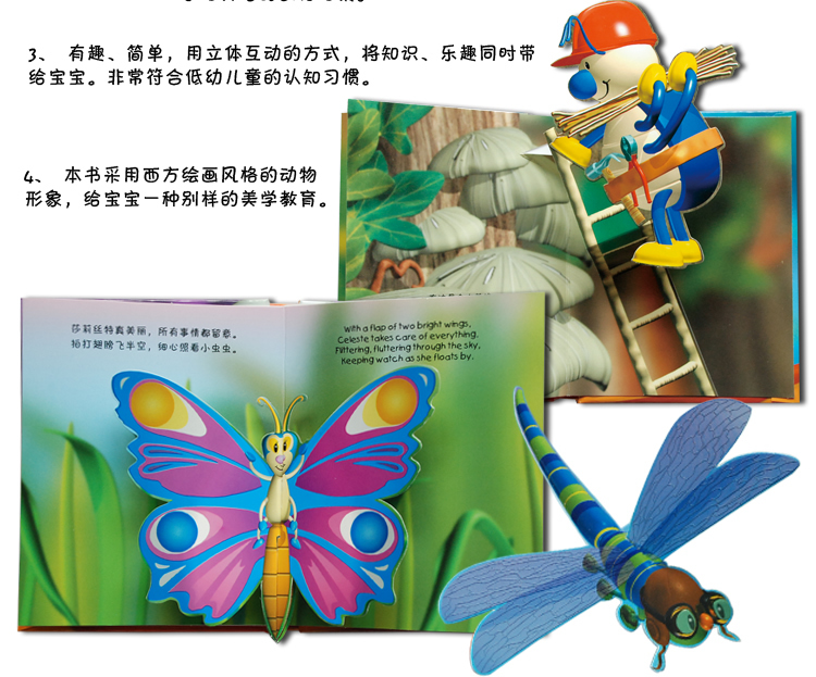 本图书获得2007~2008年度最佳创意少儿图书奖,小巧的开本,保留大虫子的力图制作效果,更适合宝宝翻阅,培养学习主动性;绚丽的色彩,三维立体图像,给宝宝最大的视觉冲击力,刺激宝宝视觉能力发展;朗朗上口的儿歌,便于宝宝背诵记忆,中英文双语对照,让孩子在自由轻松的学习环境中接触英语,开发语言潜能