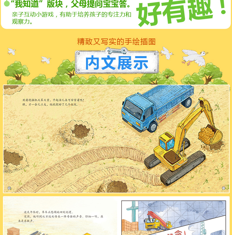 《吊车,开工啦!》一书用*人称讲述了吊车在工地的工作内容,并用一个救助村民大象的故事传达了吊车助人为乐的优良品德。在救助村民大象的故事讲述中,本书巧妙地将吊车的工作原理融入其中。