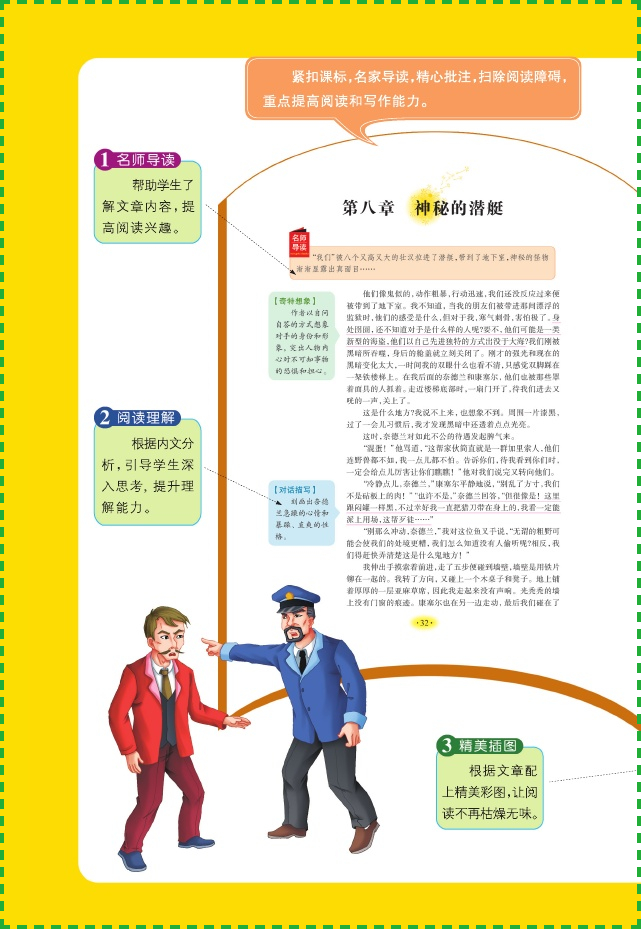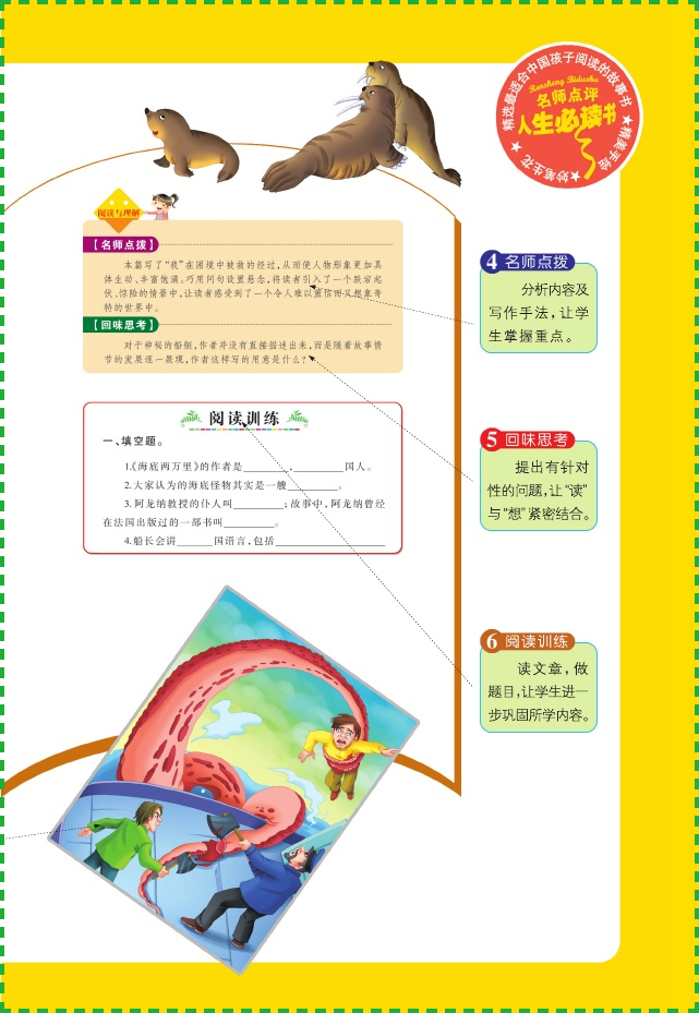 ★【人生必读书】教育部'语文课程标准'重点推荐阅读,语文专家,一线教师全程阅读指导,名师点评,精美手绘,妙笔生花,精选*适合孩子们阅读的故事书,在这个成长的季节里,让我们阅读这些永恒的经典,让书籍成为孩子的领跑者..阅读这些经典作品,使童年的阅读成为一生永远的快乐.★【大收获】一线教学专家 资深班主任 语文新课程标准 优选优编 同步知识要点 阅读提示理解=大收获★【精美手绘插图】根据文章配上精美的手绘彩图,让阅读不再枯燥无味,让孩子们兴趣盎然,增加了主人公的立体形象,让阅读更加生动有趣。★【无障碍阅读】无障碍阅读,名师详细的注释与精评会让名著回归它人生成长导师的根本功能!重难点字词注释,帮助学生理解与学习;详尽又通俗的译文,引导学生快速掌握文章内容;提升学习兴趣,享受快乐阅读的时光.★【名家导读】名师导读:帮助学生了解文章内容,提高阅读兴趣.阅读理解:根据内文分析,引导学生深入思考,提升理解能力.名师点拨:分析内容及写作手法,让学生掌握重点.回味思考:提出有针对性的问题,让'读'与'想'紧密结合. 一艘潜水艇,一个神秘的船长,一个学富五车的科学家,一个老实厚道的仆人,一个野性十足的捕鲸手,他们在将近一年的时间里,经历了各种艰险,纵横海底两万里,为我们演绎出一个个离奇的故事,让我们跟随他们的脚步去欣赏这一幅幅美丽的画卷——海底墓地、珊瑚谷……儒勒·凡尔纳编著的《海底两万里》这部出色的科幻小说,故事曲折惊险,引人入胜,画面多姿多彩,气象万千,让人读后在赞美探险者勇敢的同时也惊叹于大海的壮美!