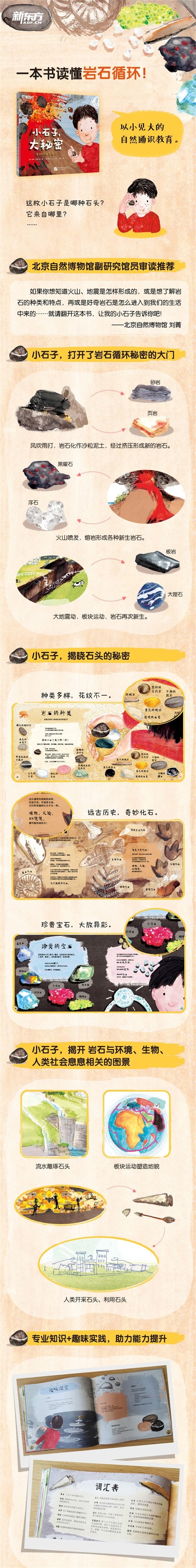 这是一本以小见大,兼具优美画风与丰富的科普知识的绘本。在这本书中,“小石子”犹如一把钥匙,打开了岩石秘密的大门。以小见大,给孩子更广阔的视角: