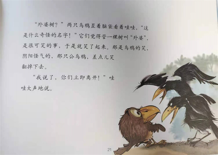 外婆树渐渐老了,不喜欢热闹了,懂事的鸟儿都把鸟窝搬走了,外婆树获得了不曾有过的安静。哇哇对外婆树又喜欢又敬仰,时常飞过来和外婆树聊聊天。突然有一天,外婆树遇到了麻烦,两只讨厌的乌鸦要来外婆树上做窝,哇哇*不允许任何鸟儿打扰外婆树的宁静……