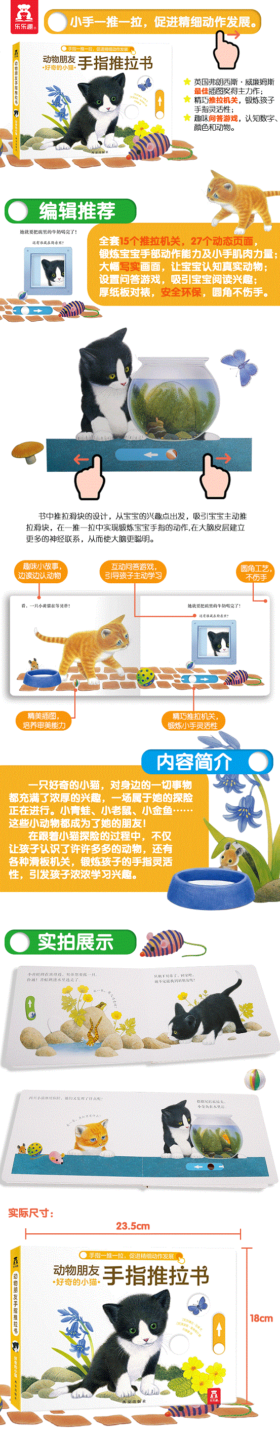 全套15个推拉机关,27个动态页面,锻炼宝宝手部动作能力及小手肌肉力量;大幅写实画面,让宝宝认知真实动物;设置问答游戏,吸引宝宝阅读兴趣;厚纸板对裱,安全环保,圆角不伤手。 大脑有许多细胞专门处理手指、手心、手背、腕关节的感觉和运动信息。因此手指的动作,越精巧熟练,就越能在大脑皮层建立更多的神经联系,从而使大脑更聪明。书中推拉滑块的设计,从宝宝的兴趣点出发,吸引宝宝主动推拉滑块,在一推一拉中实现锻炼宝宝从大动作到精细动作,从大肌肉动作到小肌肉动作,从无意动作到有意动作的发展。