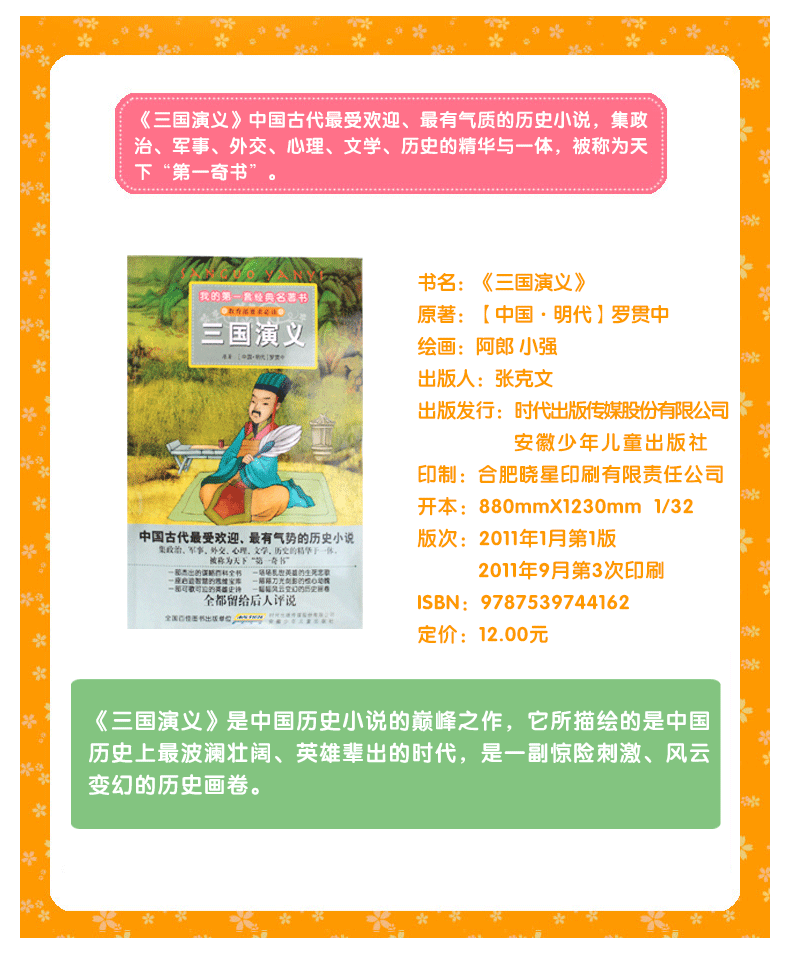 《我的第一套经典名著书》(第1辑)是一套儿童成长必备的经典读物。丛书精选了小学生语文新课标必读书目中的经典作品,全面提高小学生的文学素养,让他们真正接触和学习到经典文学名著的精髓。丛书忠实原著,精美的插图、优美的文字给予了孩子们无限的阅读快乐,启迪孩子的智慧,让他们快快乐乐地面对成长。《三国演义》是中国历史小说的巅峰之作,它所描绘的是中国历史上最波澜壮阔、英雄辈出的时代,是一幅惊险刺激、风云变幻的历史画卷。《西游记》是中国古典四大名著中最受孩子们青睐的一部著作。它讲述了唐僧、孙悟空、猪八戒和沙僧师徒四人一路斩妖除魔,历经九九八十一难,最后终于取回真经的故事。《史记》不仅是一部史学巨著,横跨了中国三千年的历史;也是一部文学著作,被鲁迅先生誉为“史家之绝唱,无韵之《离骚》”;更是一部人物百科全书,囊括了社会各个领域和阶层。《水浒传》是我国文学史上一座巍然屹立的丰碑,也是世界文学宝库中一颗光彩……