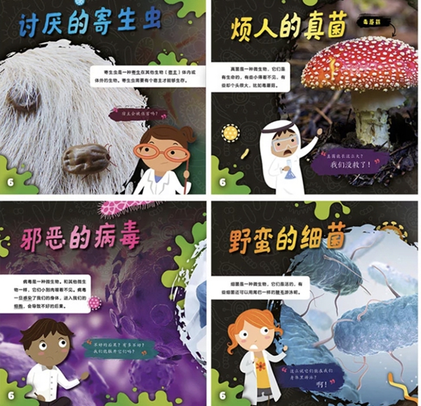 适合5岁以上儿童阅读。《是什么让我们生病?》采用简单直白、生动有趣的方式向孩子普及病原体的基本知识。在书中,孩子可以作为小小科学家、研究员去观察不同种类的病毒、细菌、真菌和寄生虫,探究它们是怎样对人体和动植物进行攻击的。书中大量的真实图片呈现了千奇百怪的病原体世界,无处不在的问答式小幽默,增强了读者的代入感,也缓解了可能出现的恐慌情绪。孩子们通过阅读不仅能认识病原体和它们的危害,也能了解关于如何预防、如何治疗的知识。