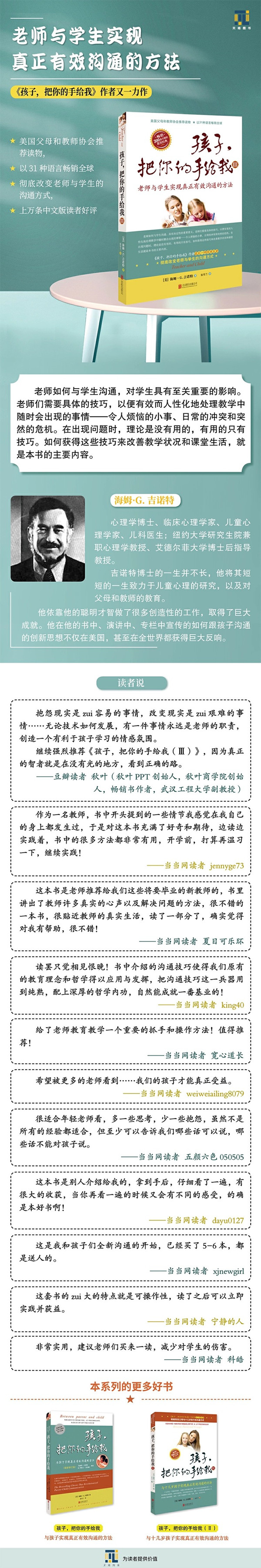 ”这是一本经典家教书。老师如何与学生沟通,对学生具有至关重要的影响。面对教室里随时都会出现的琐碎小事或突发危机,老师们需要具体的技巧来正确的应对。本书的主要内容,就是用大量的实例,阐释老师们所需要拥有的沟通技巧,以及如何运用这些技巧。这些技巧简单又实用,不需要进行大的教育变革,随时都可以由老师们运用到每天的实际教学中。利用这些技巧改变了学生们的情绪后,一切的教与学才有可能顺利进行。本书教给你的实用沟通技巧,亦可灵活运用于其他一切人际交往,有助于你改善各种人际关系。建议CIP分类为家庭教育。”