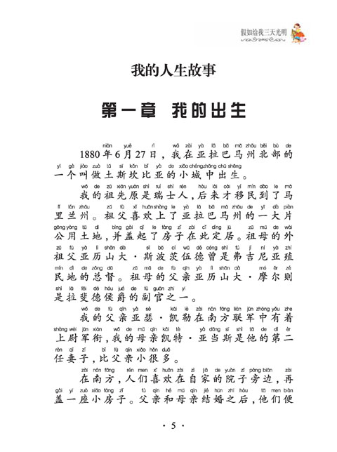 假如给我三天光明》是海伦?凯勒的自传作品。本书共分为两个部分,第一部分主要写了海伦变成盲聋哑人后的生活。刚开始,海伦的情绪非常暴躁,常常发脾气,她感觉不到现实生活中的爱,她的内心充满了对光明的渴望。直到安妮?莎莉文老师的到来,才燃起了海伦对生活的希望。随着时间的推移,海伦在老师和亲人的陪同下,学会了阅读和写作,认识和体会了许多不同的事物。凭着海伦坚强的意志,她闯过一个个困境,从考入大学到走进社会,一路的艰辛和努力,足以让我们动容。第二部分是海伦的散文代表作《假如给我三天光明》,这是本书中最精彩、最有影响力的篇章。在散文中,海伦假想自己如果有三天的光明将会去做什么:第一天,她要看到老师和亲朋好友,好好端详他们的面孔,将他们的外貌深深地印在心上。第二天,她要去参观博物馆、戏院或电影院,了解人类和自然界的真实面目。第三天,她要在现实世界里,在从事日常生活的人们中间度过平凡的一天。三天的活动,充实而短暂,海伦以一个身残志坚的柔弱女子的视角,告诫身体健全的我们应该好好珍惜生命,珍惜时间,热爱生活,关爱他人。