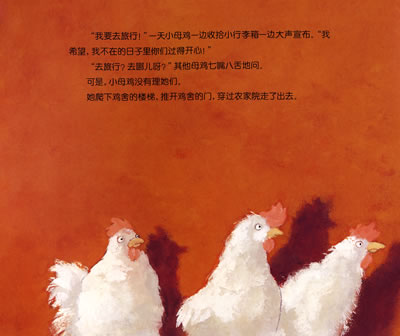 去旅行,这肯定很好玩儿!小母鸡心里美滋滋地想。可是,农家院里的其他母鸡却纷纷嘲笑她。不过,小母鸡才不管呢!她就是要去旅行!收拾好小行李箱,小母鸡神气十足地走出了鸡舍。等到邻家农家院的拖拉机刚好经过时,小母鸡迅速地跳了上去。前往“火鸡鲁鲁岛”的旅行开始喽……