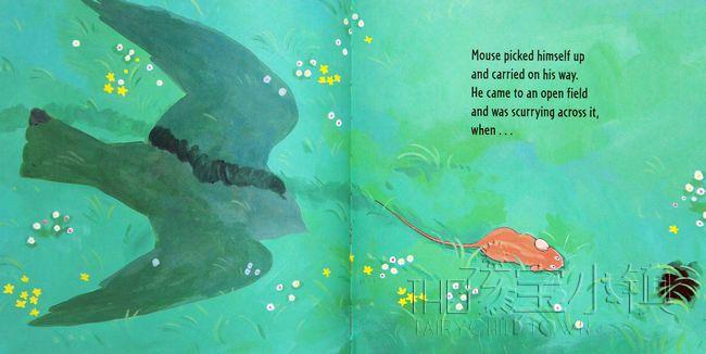 小老鼠继续往前走,不小心又掉进一个洞里,正好躲过一只老鹰的追捕,老鹰扑倒在地,头上冒金星。这时小老鼠感觉好困,就想找个地方休息一下,却坐到了一棵带刺的植物上,它腾的一声就跳了起来,正好躲过了一条蛇的扑咬,大蛇的舌头上粘满了刺。