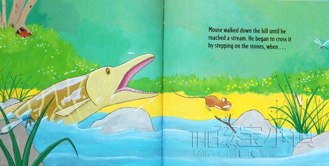 小老鼠要过一条河,它用树枝撑着却不小心掉进水里,正好后面一条鱼张嘴咬到了树枝,小老鼠努力的游呀游,终于爬到岸上,看到一只青蛙和一些漂亮的花,它觉得自己会得感冒。