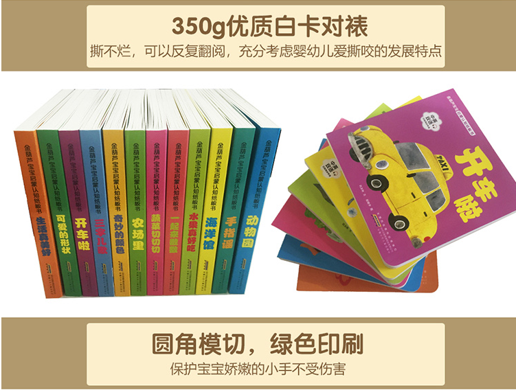 350g优质白卡对裱,结实耐用,撕不烂,可以反复翻阅,充分考虑婴幼儿爱撕咬的发展特点;圆角模切,绿色印刷,保护宝宝娇嫩的小手不受伤害。