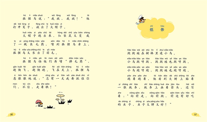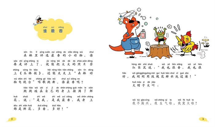 《红袋鼠幽默童话》(共5册)曾荣获中国出版政府奖。本套图书风趣幽默,每本包含10~12个小故事,“百变”红袋鼠、“大力士”火帽子和“千里眼”跳跳蛙等主人公拥有了不同的魔法本领,故事轻松幽默,阅读起来非常快乐,且能让孩子受到教育和启发。此次推出的注音版,定位幼小衔接。 《狐狸鸟》讲述的是,红袋鼠、火帽子和跳跳蛙,三个好朋友团结协作用智慧和勇气战胜狡猾的狐狸鸟的故事。一只诡计多端又会飞会变魔法的狐狸鸟,因为特别想吃火帽子,就用香料骗来了火帽子。在红袋鼠和跳跳蛙奋力救走火帽子后,狐狸鸟又扮成摄影师把火帽子骗进了铁笼子,想把火帽子烤成香香的烤鸡吃掉。幸亏红袋鼠他们及时赶到,用“掉毛药”让狐狸鸟全身掉毛,救走了火帽子。吃不成火帽子的狐狸鸟,换了目标,使出花招,抓住了跳跳蛙,准备吃烤蛙。红袋鼠拿起水枪水炮,再一次和小伙伴们战胜了狡猾的狐狸鸟。后来,为了保护几只可...