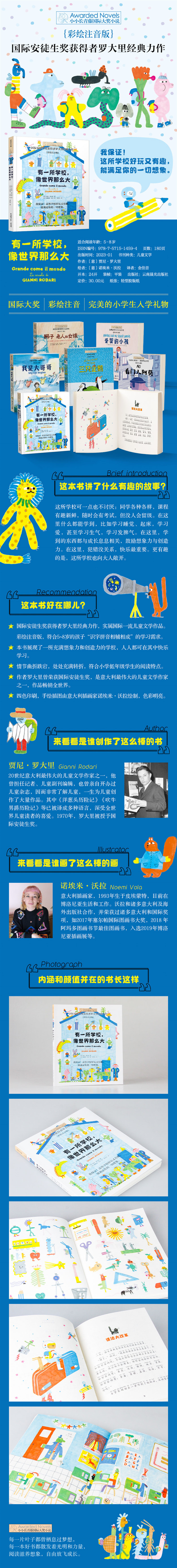 ★《有一所学校,像世界那么大》是国际安徒生奖获得者罗大里经典力作,文学性与趣味性并重,属于国际一流水准的儿童文学作品。 ★本书是彩绘注音版,符合5~8岁的孩子“识字拼音相辅相成”的学习需求。国际大奖小说保证了故事的经典性与可读性,能够让孩子在上学之初即与世界孩子站在同一起跑线上。 ★学校是每个孩子的生活中最重要的地方之一,本书展现了一所充满想象力和创造力的学校,让学校成为让孩子放飞想象力的地方。在罗大里创造的这所童话学校里,人人都可以在精彩有趣的故事中学习。 ★本书作者贾尼·罗大里是20世纪意大利最伟大的儿童文学作家之一,曾获国际安徒生奖。他一生为儿童创作了大量作品,深受全世界儿童读者的喜爱。