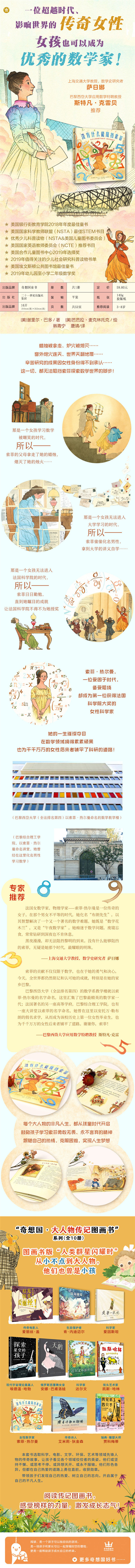 一位超越时代、影响世界的传奇女性,冲破世俗与偏见,活出真实的自己!启迪读者忠于自己的内心,坚守梦想,并为之奋斗。 每个大人物的非凡人生,都从孩童时代开启。鼓励孩子学习索菲勇敢无畏、永不言弃的精神,跟随自己的热情,克服困难,实现人生梦想。 索菲的贡献不仅仅限于数学,也在于她的勇气和决心,她曾在巴黎综合理工学院以男性假名求学,从而成为该校历史上位女性毕业生,也为千千万万的女性后来者铺平了道路。 让孩子感受数学之美,更深入地认识数学与科学的关系,以及数学和我们的生活之间紧密的联系。可以跟随书中的提示,一起做一做那个著名的振动实验!