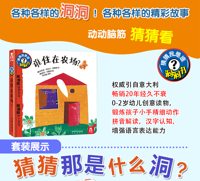这套洞洞书专为培养幼儿的阅读兴趣而特别设计。书中通过生动有趣的文字,让孩子从提供的线索中,猜猜它是哪一种动物或物品。同时,各种埋下“伏笔”的图画,也可以看图猜物,找出正确答案。这种独特的阅读引导方式,不仅能激发孩子的好奇心和学习兴趣,更为今后的学习奠定了阅读基础。这本《谁住在农场?》向我们展示了农场繁忙的景象。