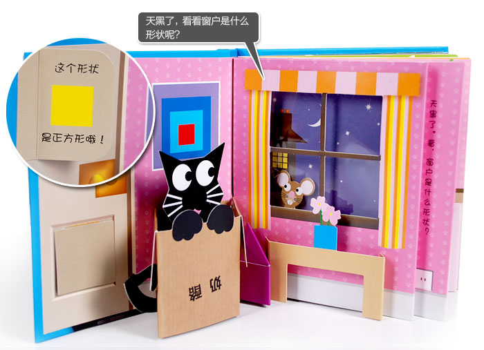 这套书真的太好了,原来只看到了颜色这本,无意中看到一套,立刻入手~我想说,这书真的太棒了。颜色那本,颜色从颜料桶喷薄而出,连我都觉得震憾,何况是小宝宝呢,当老师的亲戚过来也说,真佩服这些人的想象力~~图形那本,每一页上都有介绍,这个是什么图形,然后让宝宝找,这页里哪个是,很有游戏和趣味,适合亲子阅读,只是我家宝宝还小,再大点儿和他一起看这本~~数字那本也很好玩儿,每一页上都有个纸柄,一抽小老鼠就跑出来了,我们可以数上面有几只老鼠,老鼠们形态各异,我宝一岁,每次老鼠出来都会高兴的用手指一下,然后看看我,可能他不理解数字的概念,但是对于这个会动的书很惊奇~反义词这本我还没细看,只看了一页开-关的,是只小猫拿着锣,纸柄拉开,锣打开了,上面写着开,纸柄回来,锣就碰在了一起,上面写着关~不停的抽纸柄,然后模仿敲锣的声音,再配合开关,宝宝玩的不亦乐乎~~这就是游戏书的能量吧,寓教于乐,寓情于景。真希望这样的好书,可以给更多的宝宝带来欢乐,这套书几个月的宝宝到两三岁应该都适合,强烈推荐~!——当当网网友