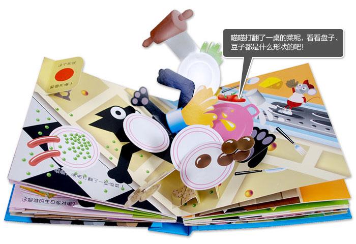 本书总共4册,翻开每一本,里面都有精心设计的立体活动纸艺场景,拉一拉,翻一翻,瞧,画面动起来了!在快乐的阅读游戏中让宝宝学习基础知识。真不亏为立体书大师——戴维?佩勒姆的经典作品。当你打开书,各种缤纷的色彩立即跳到眼前,好像是谁泼出来的一样,有一种特别强的视觉震撼力。再看看我们调皮的主角们——喵喵和吱吱,哇,它们正在学画画呢!可是你看看,调皮的吱吱居然把颜料打翻了,弄的到处都是。这种欢乐的故事场景,有很强的代入感,当宝宝翻开书,活动的立体互动方式,让他们也参与其中,享受阅读带来的快乐。在魔术大舞台上,你看,喵喵和吱吱正在配合着给宝宝们表演“放入”“取出”的魔术游戏呢。宝宝们只需左右动动小手,跟着喵喵和吱吱的游戏,便能很容易的明白“放入”与“取出”的相对意思了。这个过程就像看动画片轻松自在有趣。这套书就像在纸上表演的动画片,对于我们经常接触图书的编辑的都是惊喜,对于凡事都好奇的宝宝来说就更不用说了。
