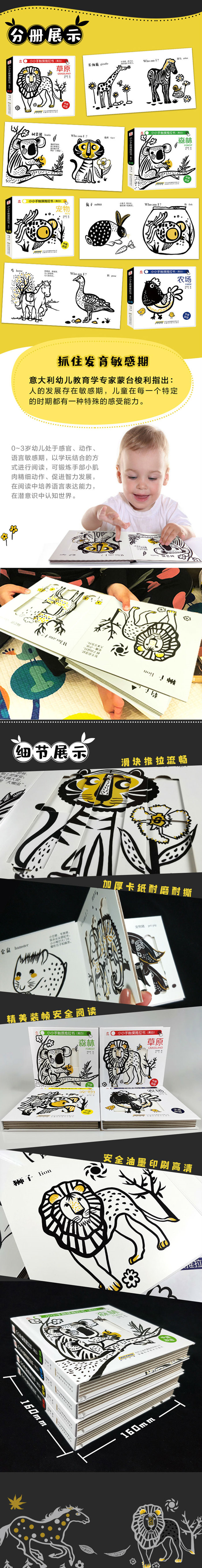 本书通过有趣的互动形式──纸板、可拉动标签等,让小朋友认识日常生活中和大自然中的各种动物,了解这些动物的形象和基本习性。本书通过各种可爱的卡通动物形象、中英文双语名称和简单生动的文字,让孩子阅读本书时不仅可以学习到丰富的知识,还可以在翻阅机关时,实现手脑互动,增添阅读的乐趣,引导孩子探索动物世界。在童趣中了解动物的相关知识,从小培养孩子们对自然知识的兴趣。