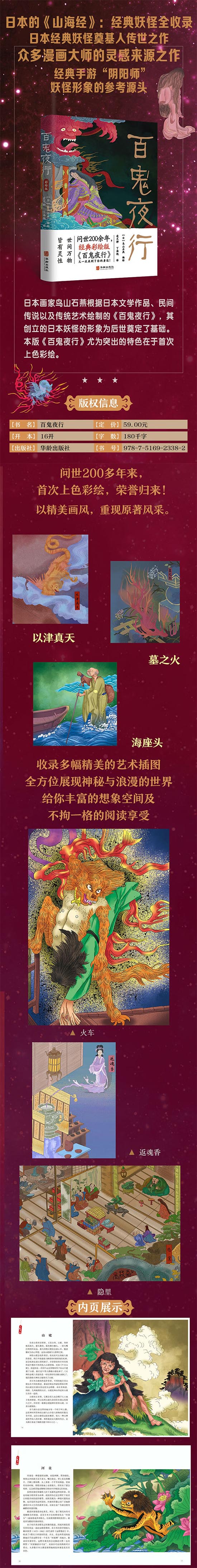 日本浮世绘画家鸟山石燕根据日本文学作品、民间传说以及传统艺术绘制的《画图百鬼夜行》《今昔画图续百鬼》《今昔百鬼拾遗》《百器徒然袋》被后人合称为《百鬼夜行》,其创立的207个日本妖怪的形象为后世奠定了基础,设定了规范,具有极高的文化价值和艺术价值,成为研究日本民俗、传统文化、艺术史的推荐阅读之作。