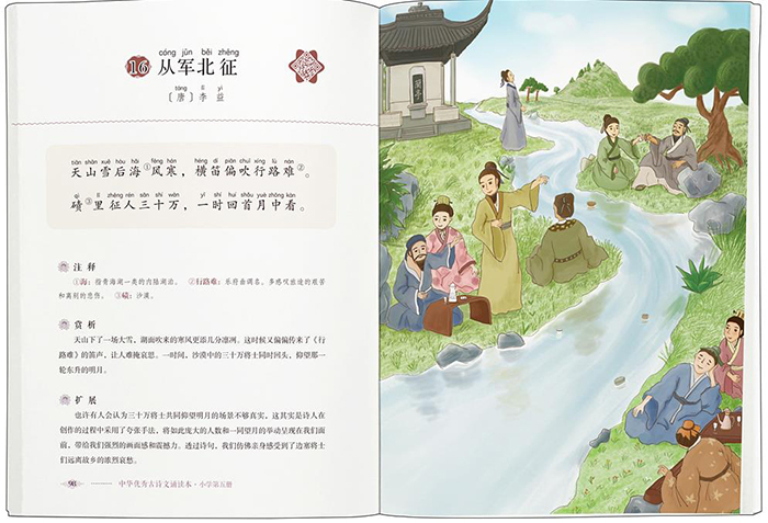 本书采用双色印刷,并选取极富诗意的诗篇绘制了彩色插图,让小读者在诗情画意中快乐诵读。