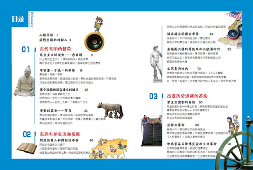 本书以“世界历史事件”为主题,以图文并茂的方式向孩子们介绍了古希腊的民主主义诞生、古中国的秦统一六国、古罗马帝国的建立与灭亡等代表古代文明的历史事件;在“东西方的交流和发展”一章中向孩子们介绍了“丝绸之路的阿拉伯商人和阿拉伯帝国”,“发现新大陆的哥伦布和大航海时代”以及“文艺复兴”等历史事件;在“改变历史进程的革命”一章中,则向孩子们介绍了“清教徒革命”和“光荣革命”,“法国大革命”“工业革命”等历史事件;此外,还介绍了“小威尼斯——委内瑞拉”“探戈的国度——阿根廷”“陆地的尽头——智利”。从古代文明的繁荣,到改变历史进程的大事件,本书让孩子们通过历史事件了解人类历史发展的进程,丰富了孩子们的历史知识,并向他们提供了了解历史的不同角度,开阔了他们的视野。