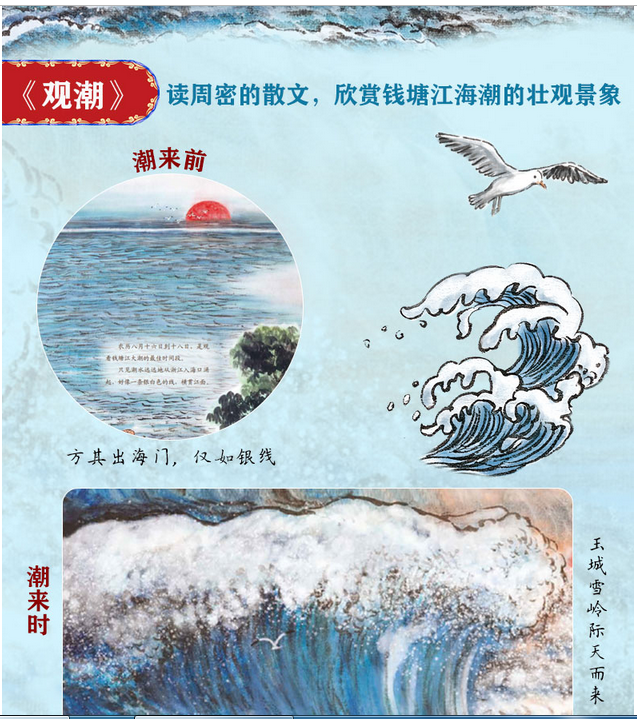 《观潮》是宋代文学家周密创作的一篇散文。本文描写了观潮的盛况,将自然美、人情美巧妙地交织在一起,使读者身历其境。让我们跟随周密的文字,打开那扇观看钱塘江大潮的视窗,弥补那不能身临其境的遗憾。 本书由特级教师王淑杰撰写译文,由新锐插画师吴幸婷绘制插图,并配有原文和解读,对儿童的文言文学习非常有帮助。
