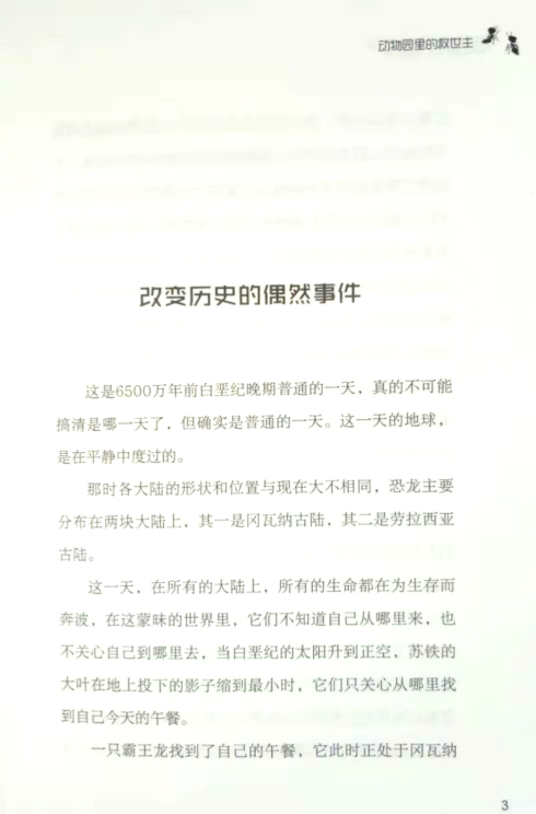 在这一天,在所有的大陆上,所有的生命都在为生存而奔波,在这蒙昧之中的世界,它们不知道自己从哪里来,也不关心自己到哪里去,当白垩纪的太阳升到正空时,当苏铁植物的大叶在地上投下的影子缩到最小时,它们只关心从哪里找到自己今天的午餐。