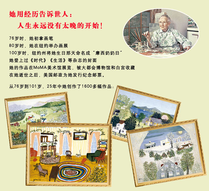 3.摩西奶奶是一位自学成才的画家,她的画里充满了生活气息,作品风靡美国、英国、法国、加拿大、日本等全球50多个国家,深深影响了三毛、渡边淳一等文学大师。