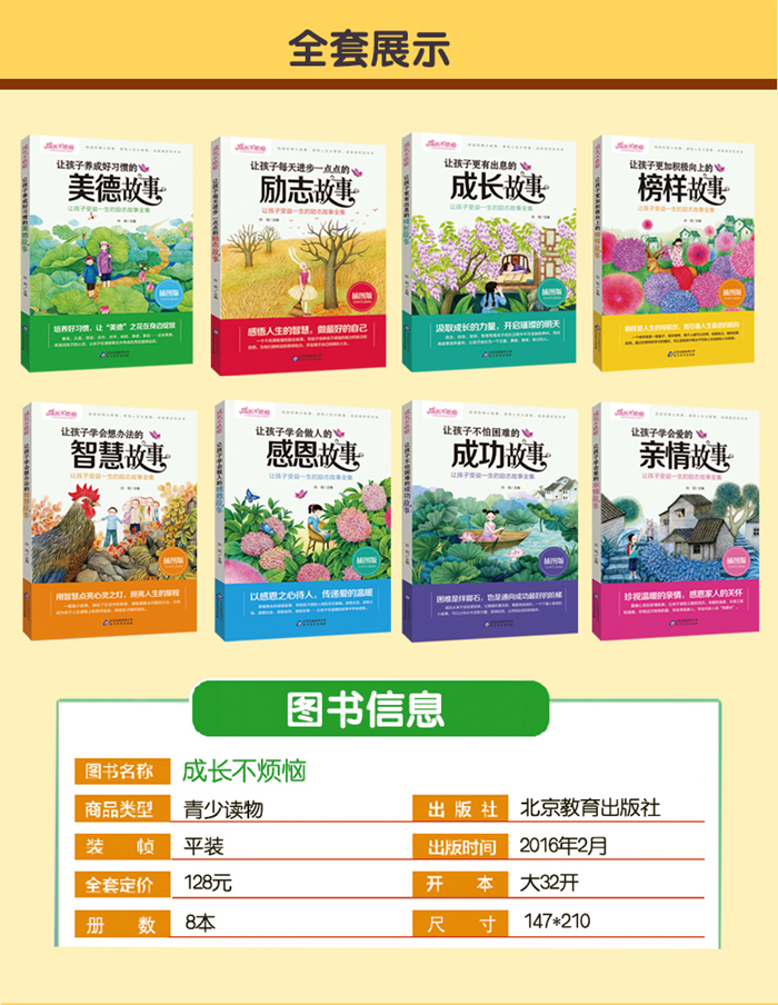 成长不烦恼”是一套专为8—12岁孩子打造的成长励志书,包括感恩故事、亲情故事、励志故事、成长故事、智慧故事、成功故事、榜样故事及美德故事,通过蕴藏在故事背后的哲理,给予孩子们无穷的力量,帮助他们培养正确的人生观和价值观,让孩子们更勇敢地面对成长过程中的荆棘,使得成长不烦恼。