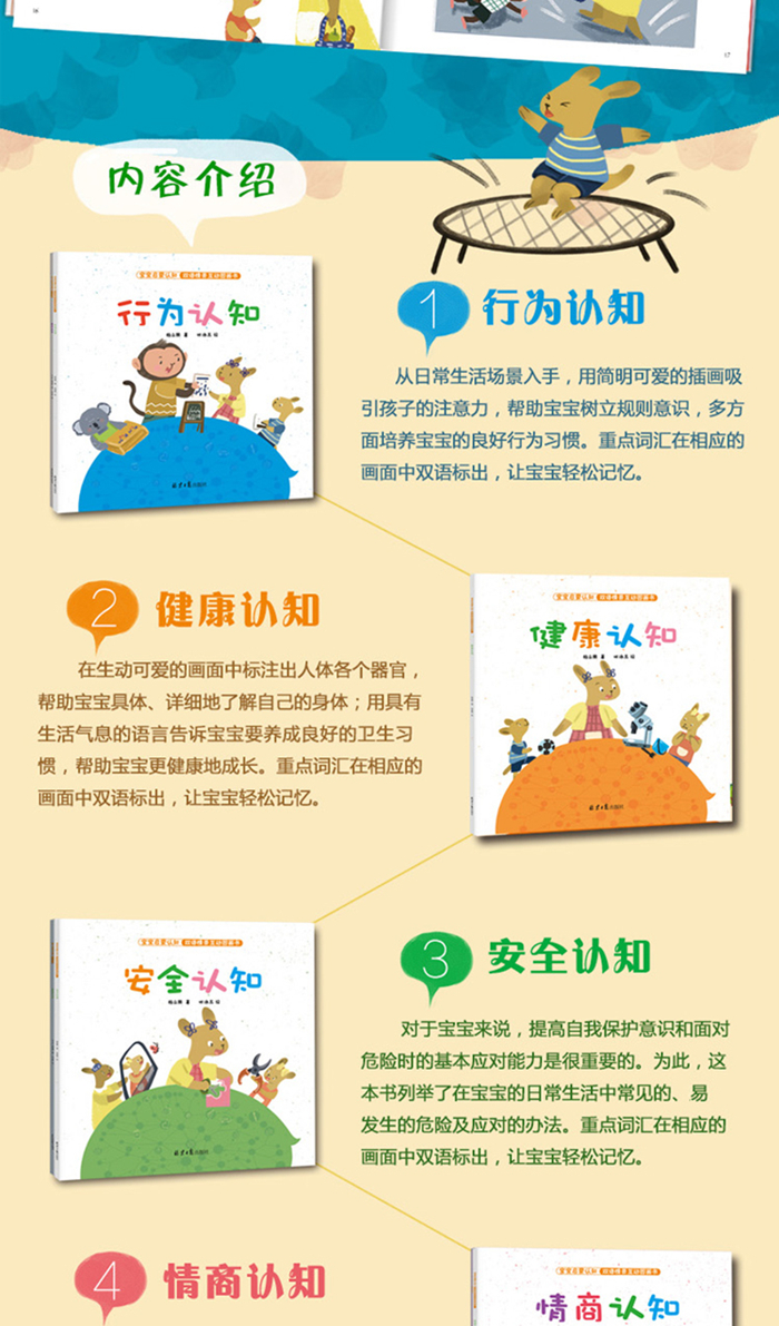 《 情商认知》通过多种可爱的动物形象之间的交流,向宝宝展示使用文明礼貌用语、懂分享、自信、勇敢等多种良好品质,全面促进宝宝情商发展,提高与人交往的能力。重点词汇在相应的画面中双语标出,让宝宝轻松记忆。