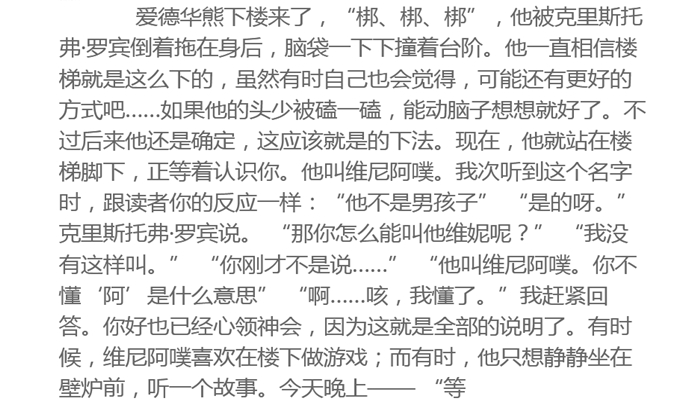 小熊维尼是英国著名剧作家、小说家、童话作家和诗人A.A.米尔恩(A.A.Milne,1882-1956)为儿子创作的一个有趣的童话形象。维尼熊看似憨憨傻傻,但是他非常仗义,对朋友非常关心。他和小猪、小兔、驴子、袋鼠一家还有小老虎一起住在百亩林,他们之间非常友爱,但是偶尔也会有点小矛盾;每个小动物都是善良、热心的,但是偶尔也会犯糊涂。他们还有一个共同的朋友:罗宾。他们天真可爱,做起事来常常让人捧腹大笑,他们走到哪儿,哪儿就充满欢笑、童真。《小熊维尼》一书风靡全球,当然以此为蓝本的动画片《小熊维尼》更是受到了亿万儿童的热烈欢迎。