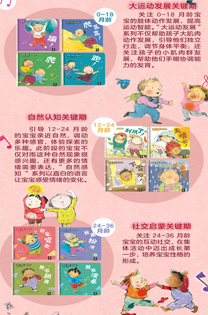 《宝宝,你好!成长绘本》抓住了宝宝成长的三个关键期——大运动发展、自然认知、社交启蒙,根据0-3岁幼儿身心发展规律和认知特点全新打造。在大运动发展系列,促进宝宝肢体动作发展;在自然认知系列,可以引导宝宝亲近自然;在社交启蒙系列,通过唱歌、跳舞、演奏、装扮,在集体活动中,引导宝宝勇敢迈出社交*步。