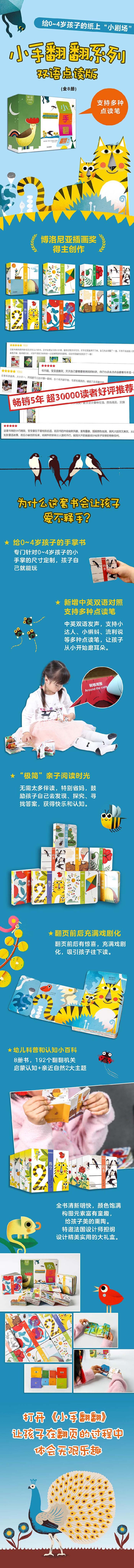 《小手翻翻系列·双语点读版》共8册,全新升级后,包含中英双语对照,可使用多种点读笔点读,总共有900+个位置可点读。这套书包含亲近自然和启蒙认知2个主题,生动有趣的语言描述,构思巧妙的故事情节,让孩子在趣味阅读中开始认识世界。 亲近自然主题 《四季》《小动物》《花园》《农场》 孩子是自然的精灵,天生对自然界的花鸟虫鱼有一种亲近感。这套小手翻翻将自然界的变化与常识通过幽默和戏剧化的手段呈现在孩子的面前。 启蒙认知主题 《数字》《颜色》《形状》《对对碰》 选取孩子生活中常见的事物、概念,通过设计翻页前后出人意料的变化,制造一种阅读的惊喜,给孩子独特的认知体验,会让孩子兴奋不已。